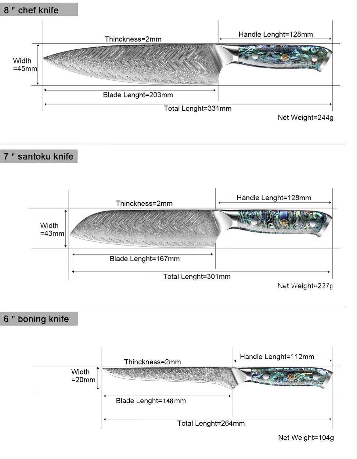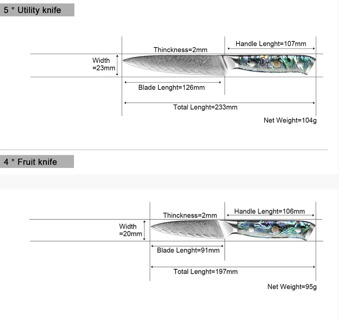 Specifications: Chef's Knife, Santoku Knife, Bone Knife, Universal Knife, Peel Knife, 5-piece Set